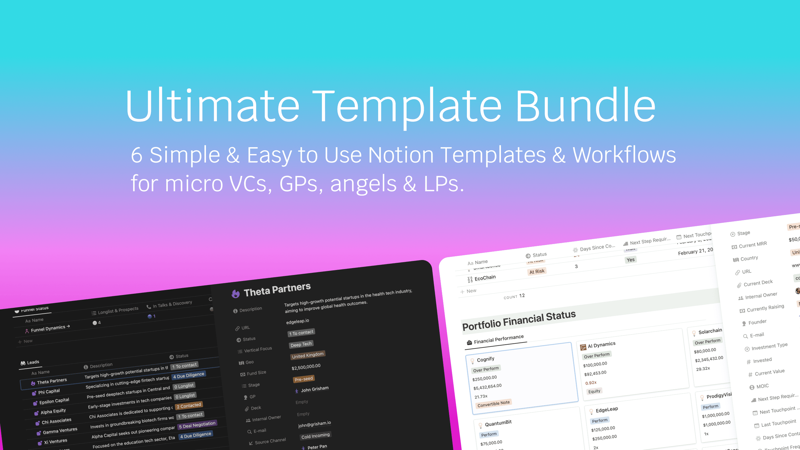 Elevate your venture capital operations by adopting the Notion VC Bundle today. Optimize your workflows, enhance collaboration, and drive better investment decisions with a set of easily customizable templates.