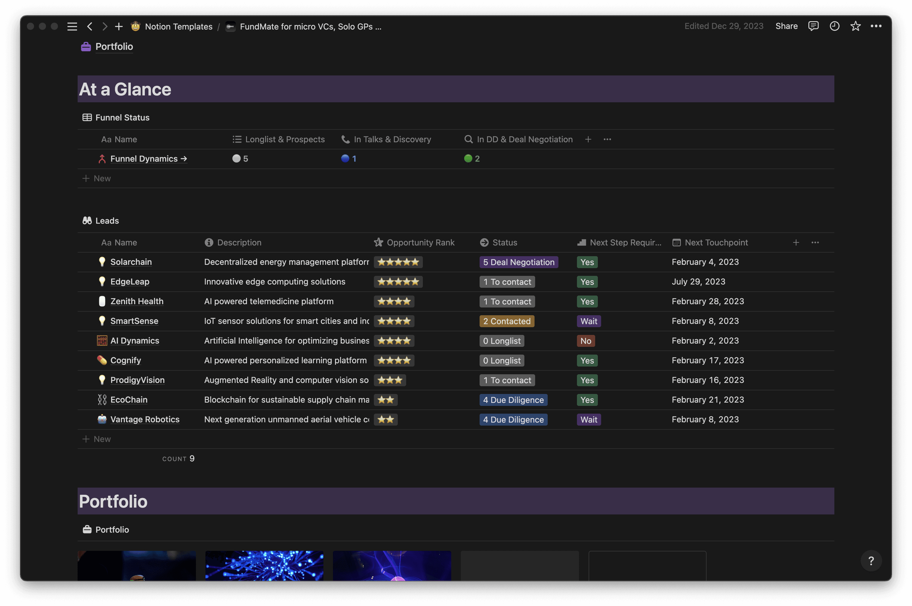FundMate is a Notion template tailored for angels, solo GPs, and micro VCs. It's born out of years of experience managing deal flow for a 5 million USD micro VC, with a focus on simplicity and affordability.